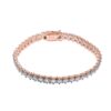 SILVER BRACELET PLATED ROSE GOLD WITH SPINAL AQUA PRINCESS CUT AND BRIGHT AQUA GREEN CZ WITH BOTTOM PLATED RUTHENIUM.