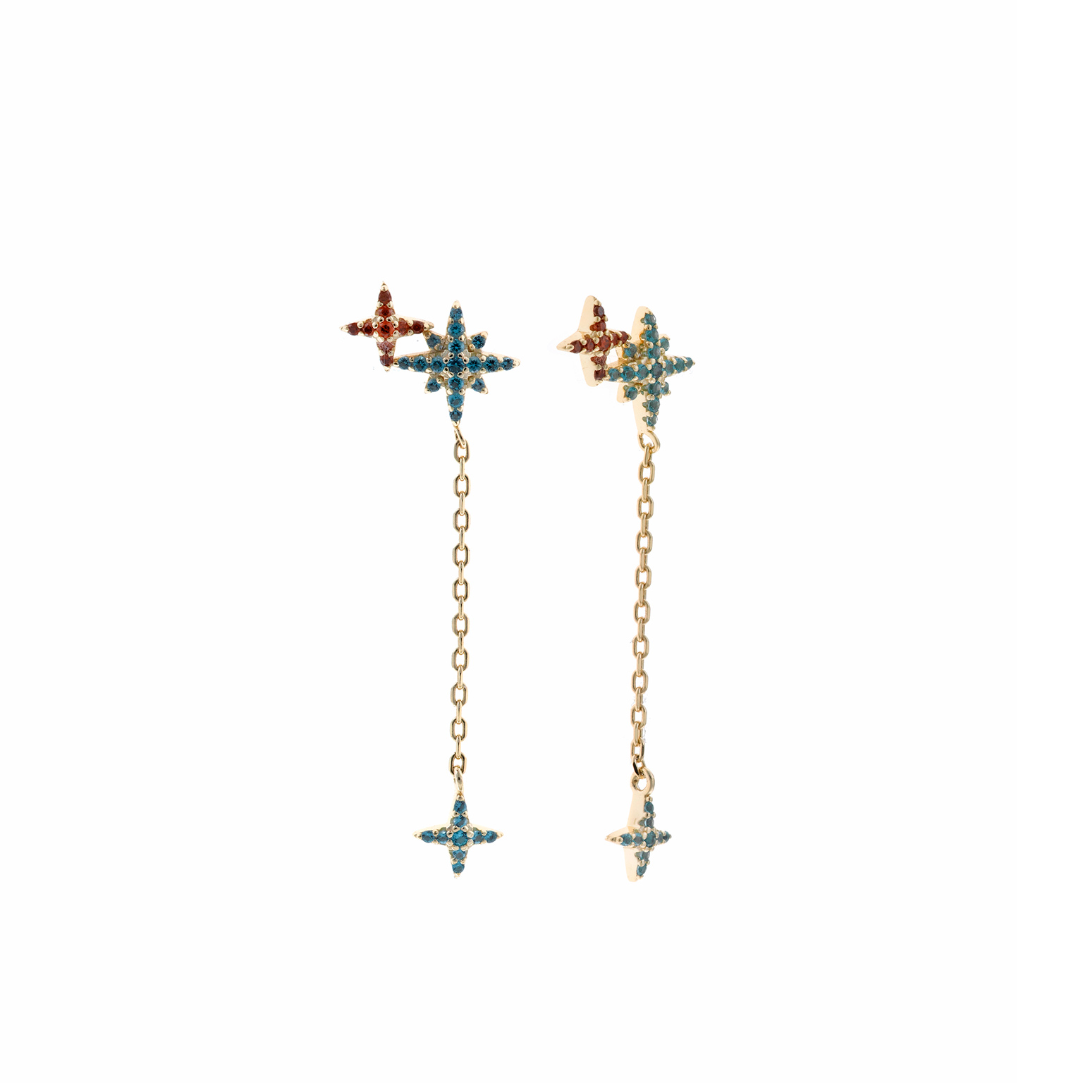 PULSERA PLATA CHAPADO DORADO ESTRELLAS Y CIRCULOS CIRCONITAS ROJAS PARAIBA BRILLANTES // BRACELET SILVER 925 PLATED GOLD STARS AND CIRCLES CZ RED PARAIBA BRILLIANT